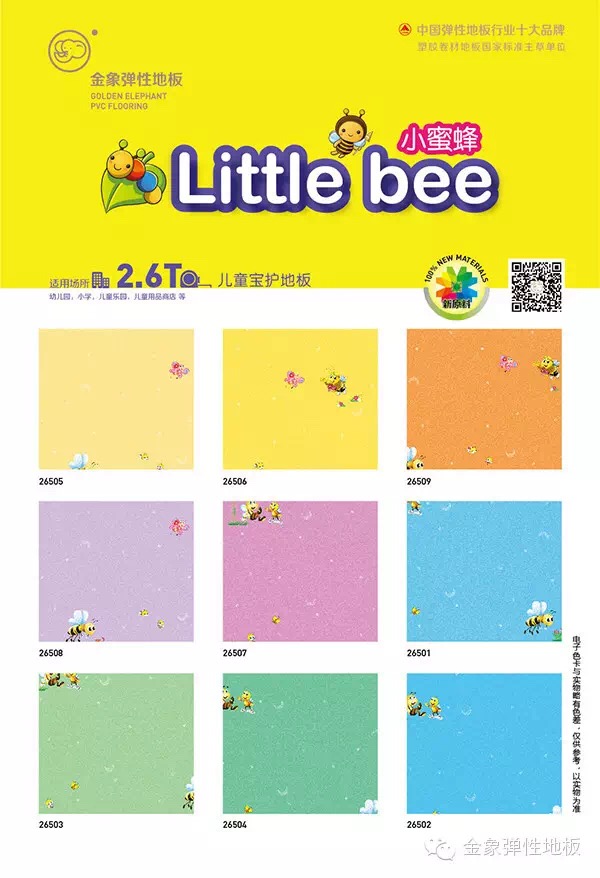 小蜜蜂系列選擇了與加強金貝貝一樣的2.6mm的厚度與0.35mm的耐磨層厚度,搭配4.5mm厚度的純色地板,以及1.0mm厚度的墻膠系列,全方位立體化的搭配足以應(yīng)付兒童教育領(lǐng)域日常學(xué)習(xí)、游戲、運動的地面空間日常要求!